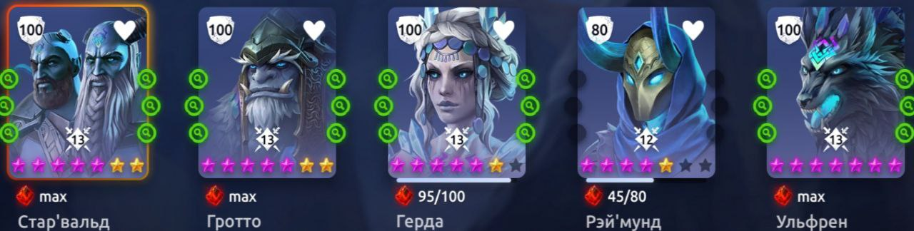 Данная сборка нередко встречается на Арене или Турнире и не зря, поскольку с таким составом Ковен Ведьм имеет самый высокий показатель мощи. Для более сбалансированного боя Теон можно заменить на Нору.