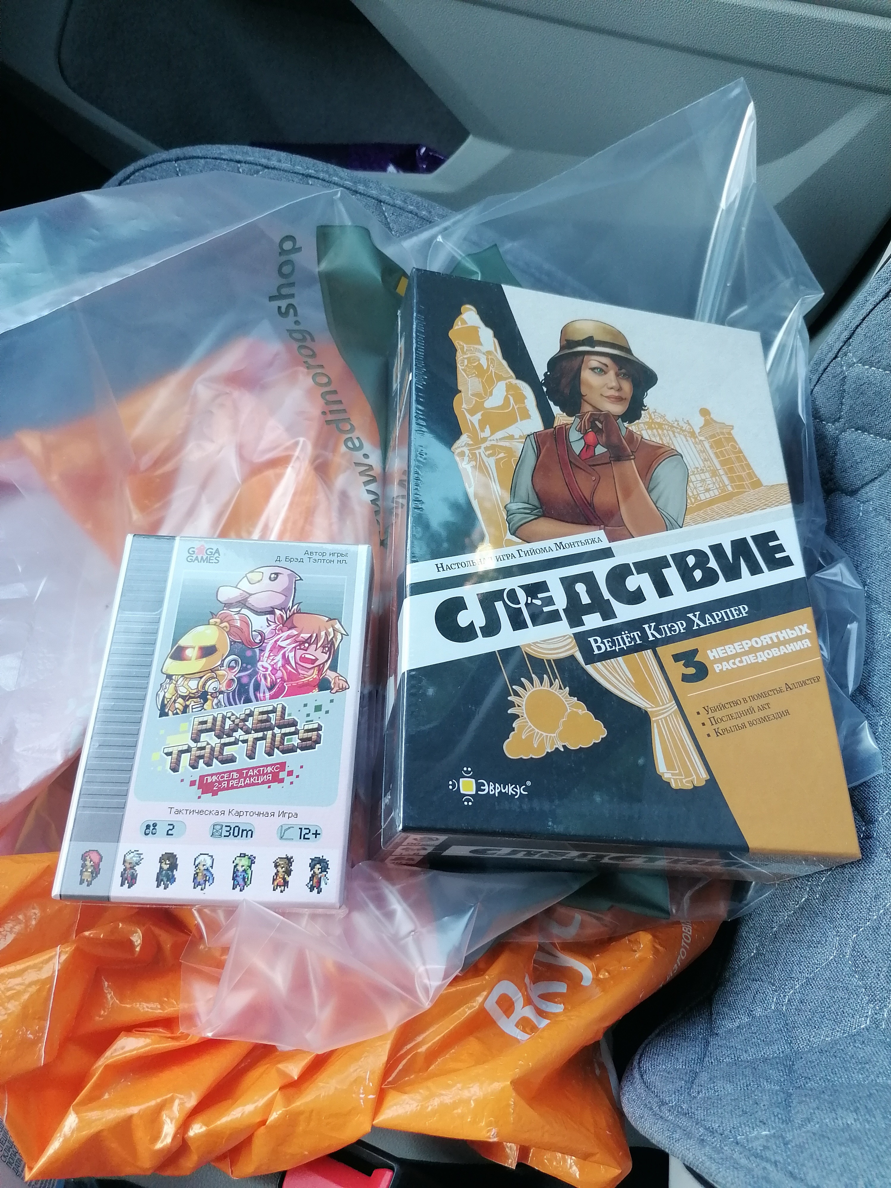 Организацию турнира владельцем магазина Виктором Носовым. Участие стоило 350р, 1-е место получил 1800р, 2-е - 900р, 3-е и 4-е - по 500р. Кроме того был случайный розыгрыш среди участников, все бросали д20. Я выкинул 20-ку и получил сертификат ещё на 500 рублей)) А ещё! Призёрам раздавали по малюсенькой игре, кому-то Тенно, кому-то ещё что-то, мне досталась самая адекватная игра Пиксель Тактикс. Открывать я её, конечно же, не буду) Ну, а на сертификат в 1400р я купил со скидкой детектив "Следствие ведёт Клэр Харпер". Слышал, что он хорош, но вот продавался не везде. И я подумал, возьму-ка сразу, пока я тут.