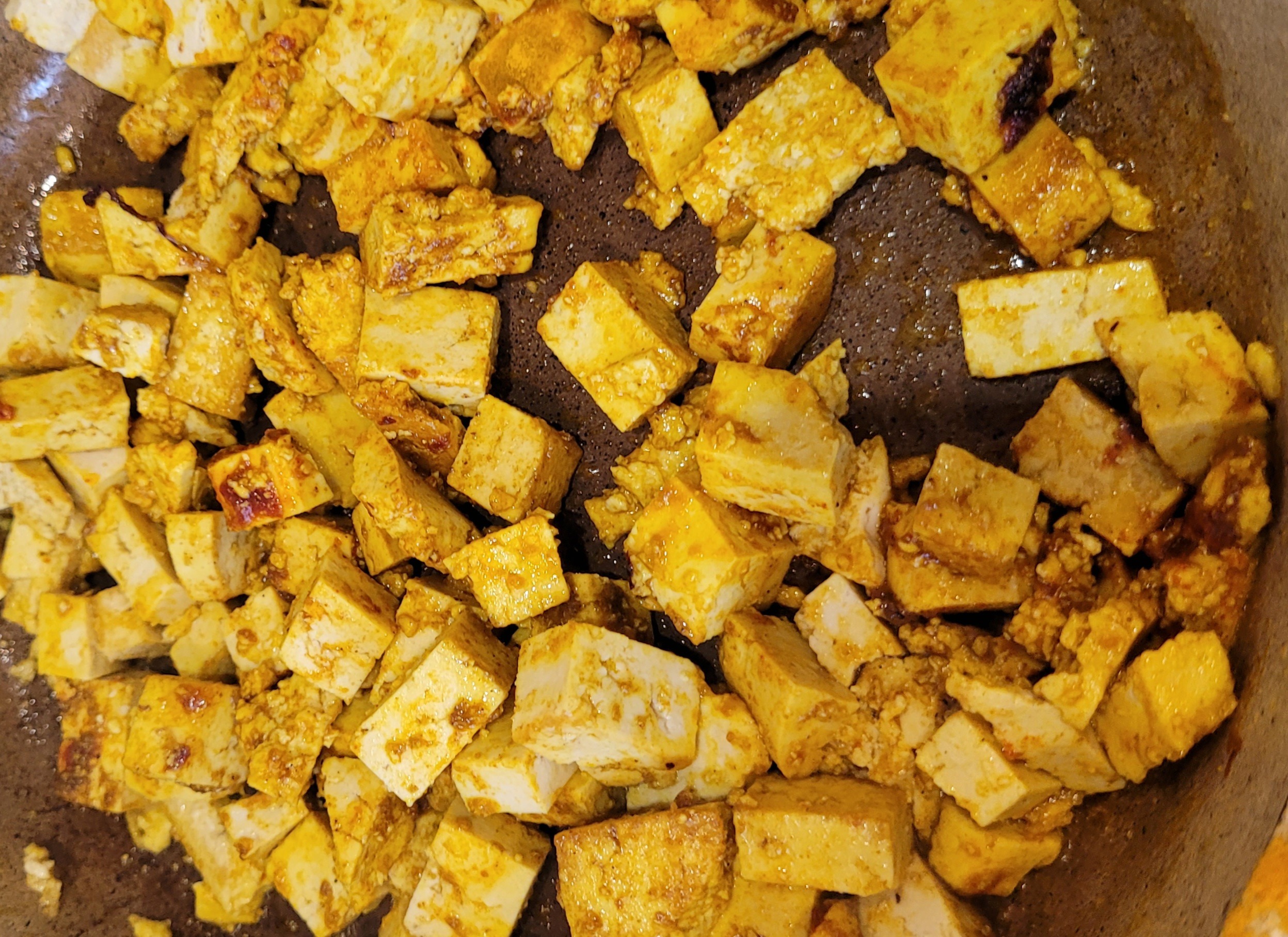 Добавить к тофу куркуму, соль, перец, гарам масалу. Обжаривать, помешивая, несколько минут.