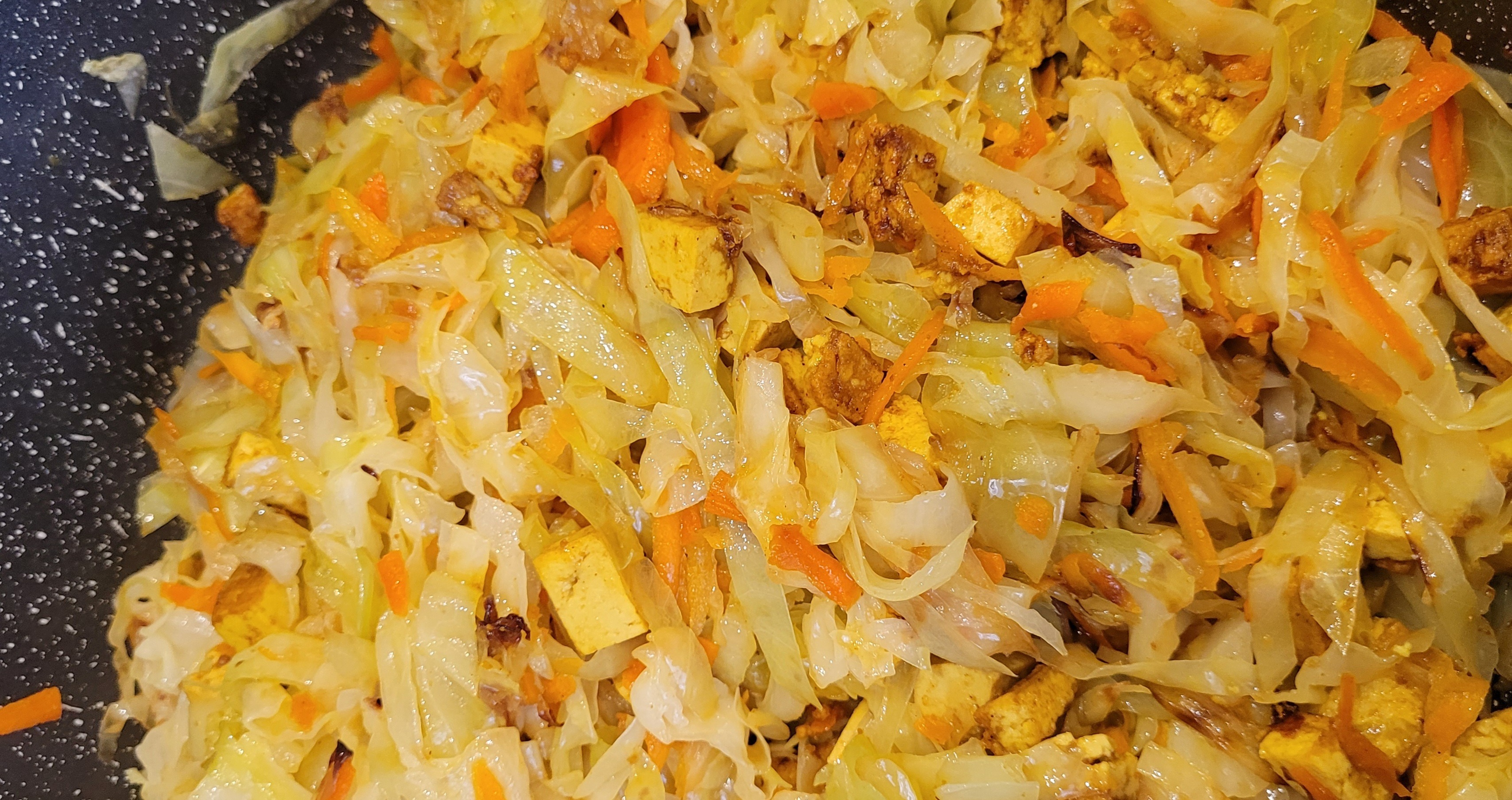 Добавить тофу к почти готовой капусте, перемешать и потушить вместе еще пару минут.