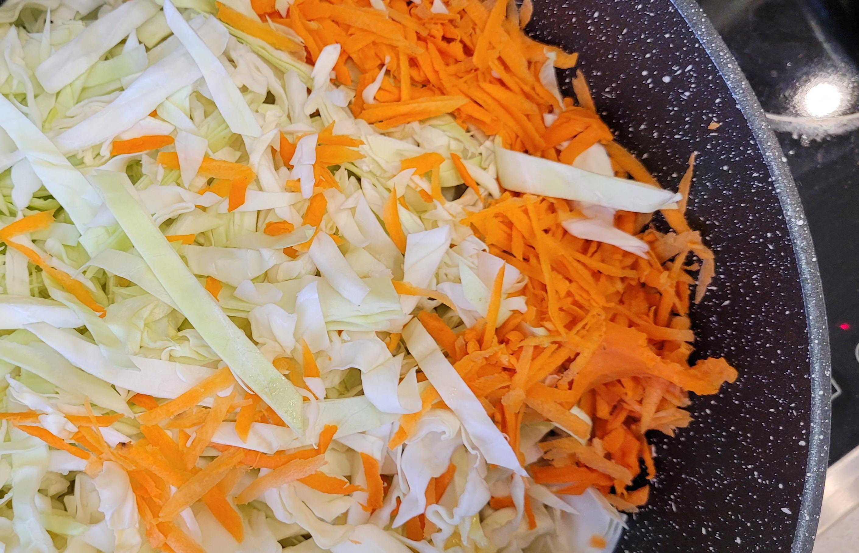 Нарезать белокочанную капусту и морковь соломкой или любым другим способом.Сложить в глубокую сковороду, долить воды и тушить под крышкой почти до готовности.