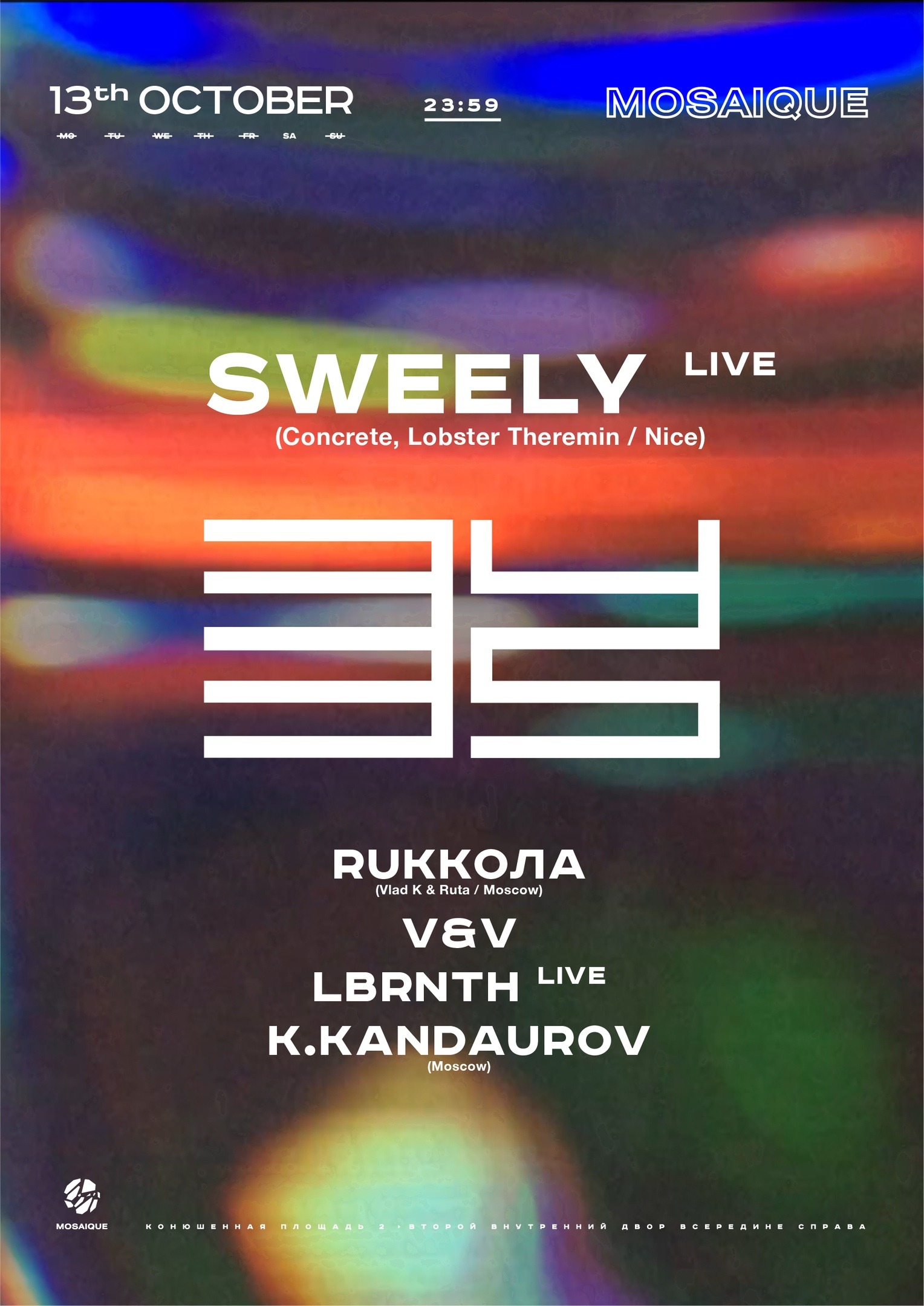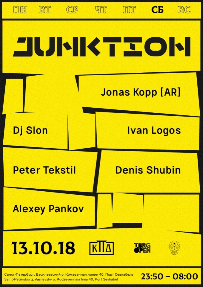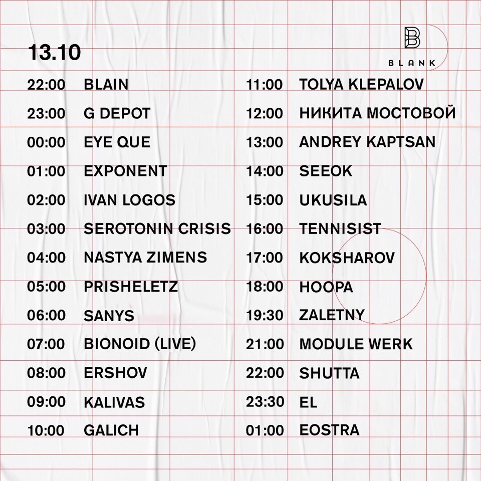 Тусовки: Суббота, 13 октябряВечеринка не закончится1) Blank2) КПД: Junction3) Mosaique: 33/454) Stackenschneider: T A K T5) Танцплощадка6) Union7) Cement8) Клуб Света