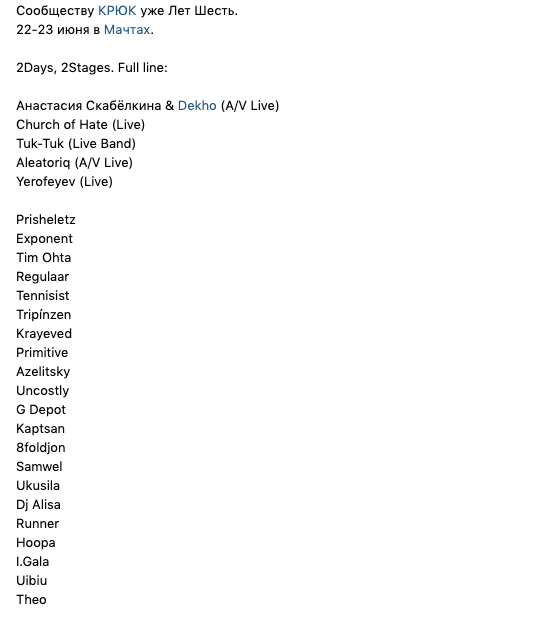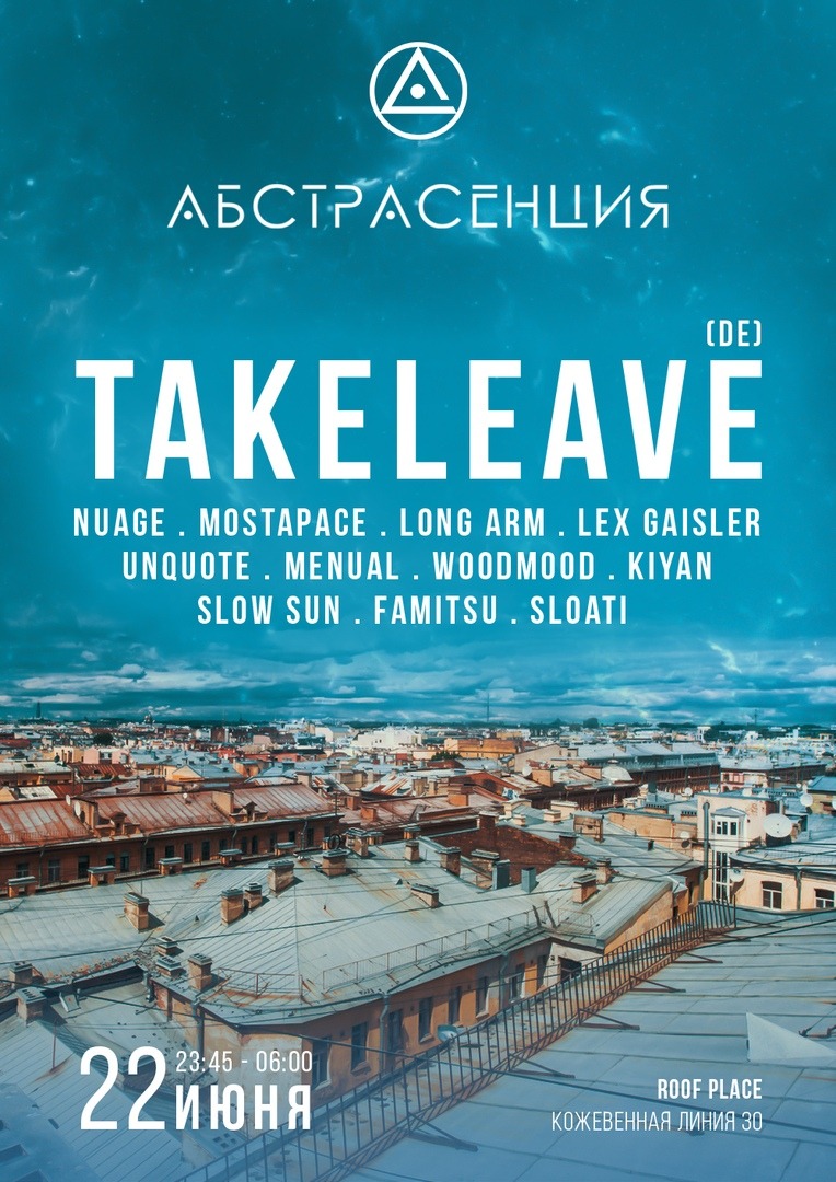 Тусовки: Суббота, 22 июняDANCE W!TH USHi-Hat Rooftop 1) Mosaique: Weird 2) Roof Place: Абстрасенция 3) Stackenschneider: TAKT 4) Танцплощадка 5) КПД: Somatik Fest 6) Union 7) Мачты 8) Kuznya