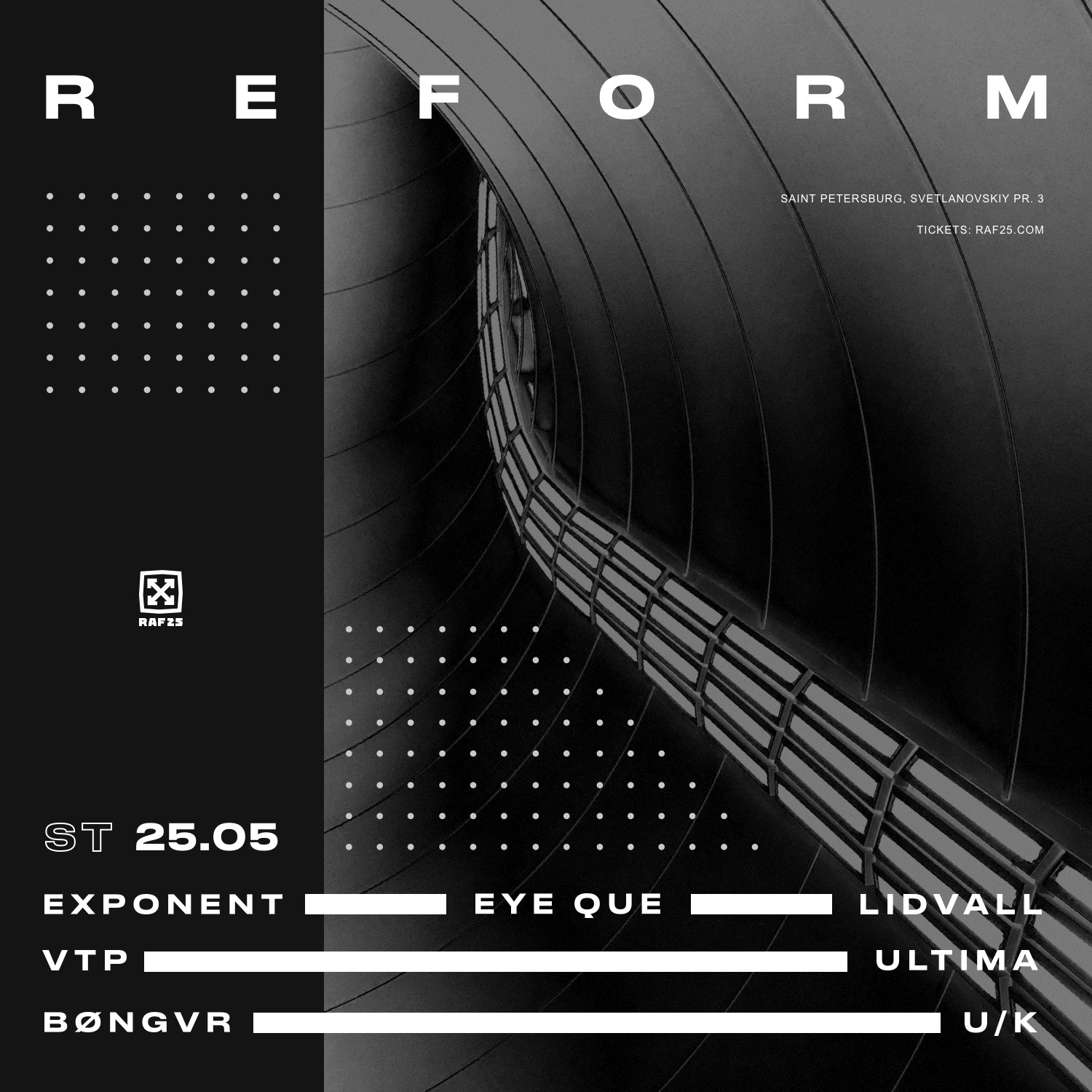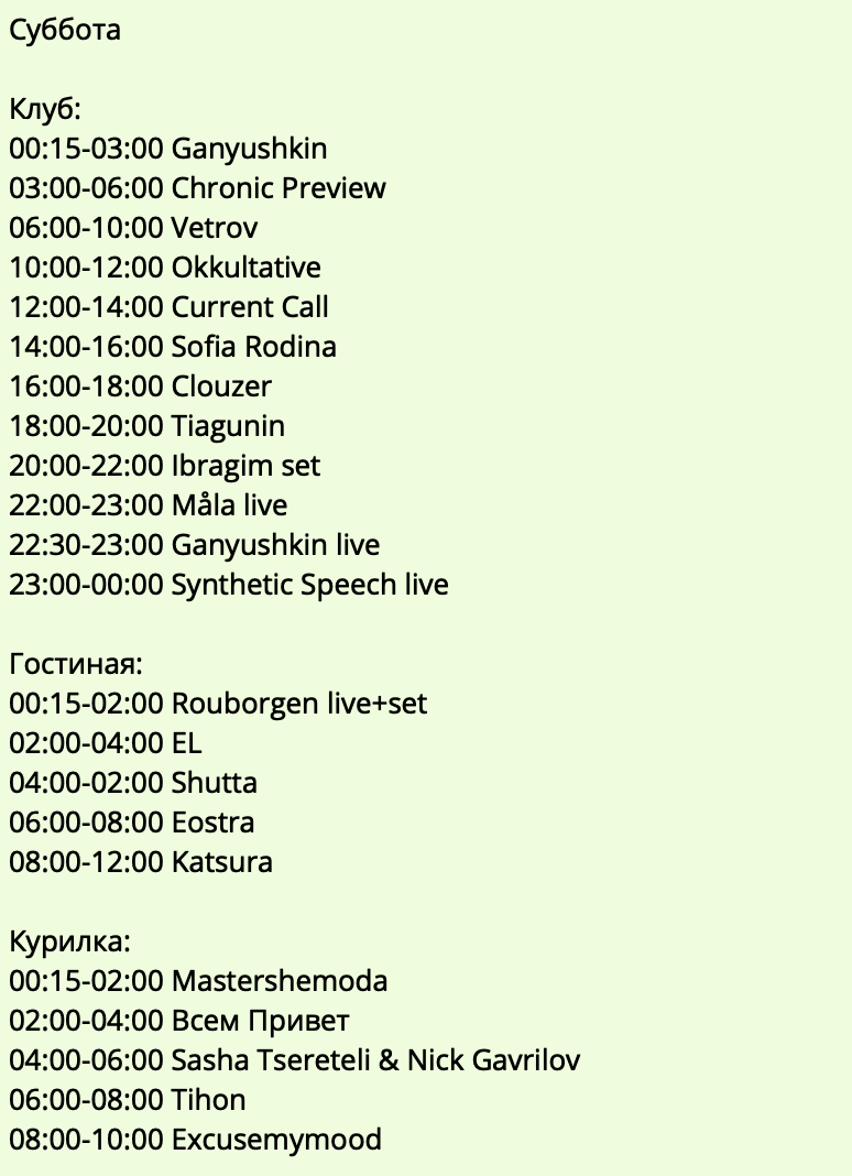 Тусовки: Суббота, 25 маяDANCE W!TH US1) Закрытие Клуба 2) Mosaique: Trium 3) RAF25: Reform 4) Stackenschneider: DS² x Afterhours5) Blank: Blank Garden 6) Танцплощадка 7) Мачты: 8) Union