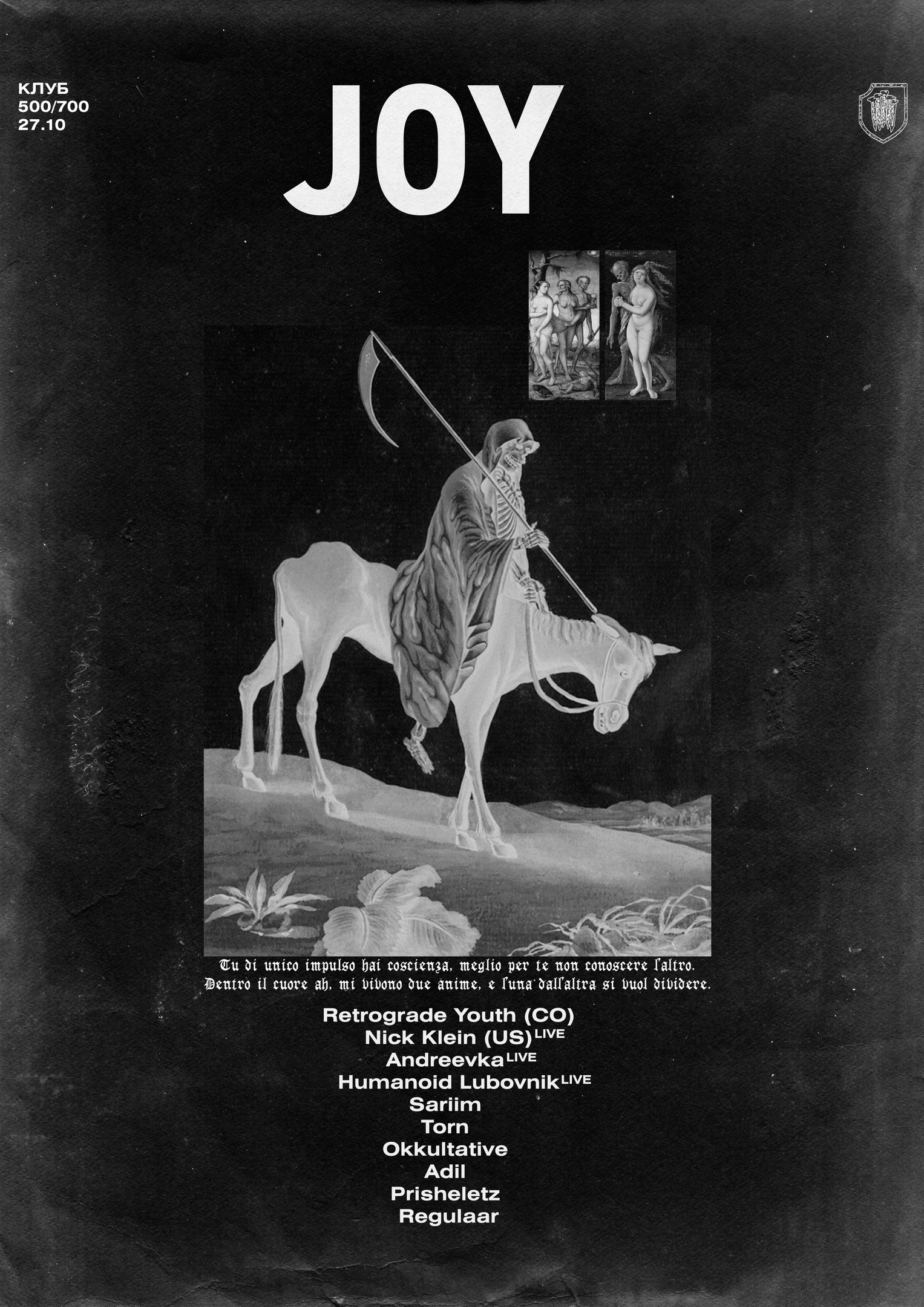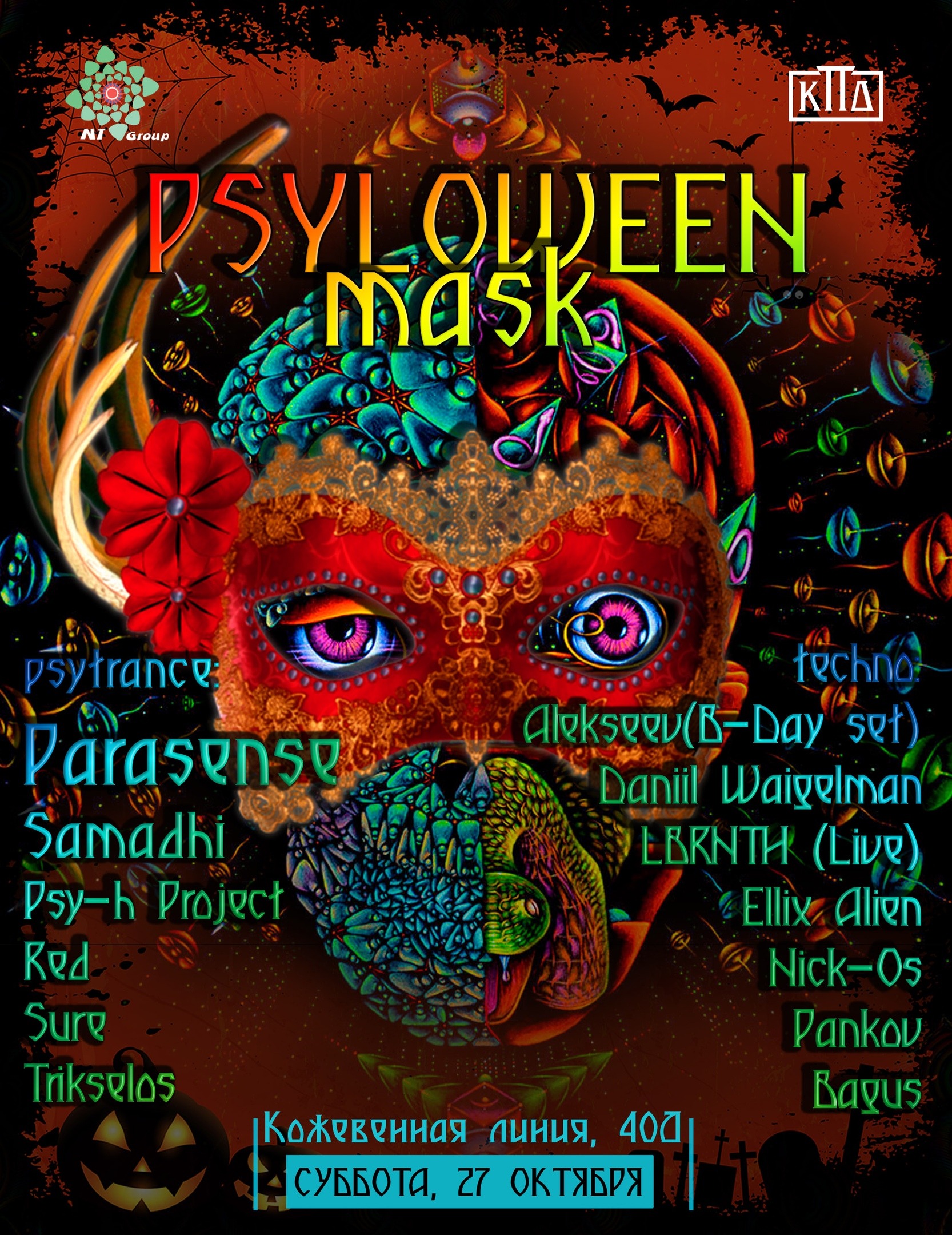 Тусовки: Суббота, 27 октябряDANCE WITH US1) Blank: Roots United Night2) Клуб: JOY3) Mosaique: Syncretism4) Stackenschneider: DS² Halloween5) Танцплощадка6) КПД: Psyloween7) Клуб Света8) Union9) Мотив