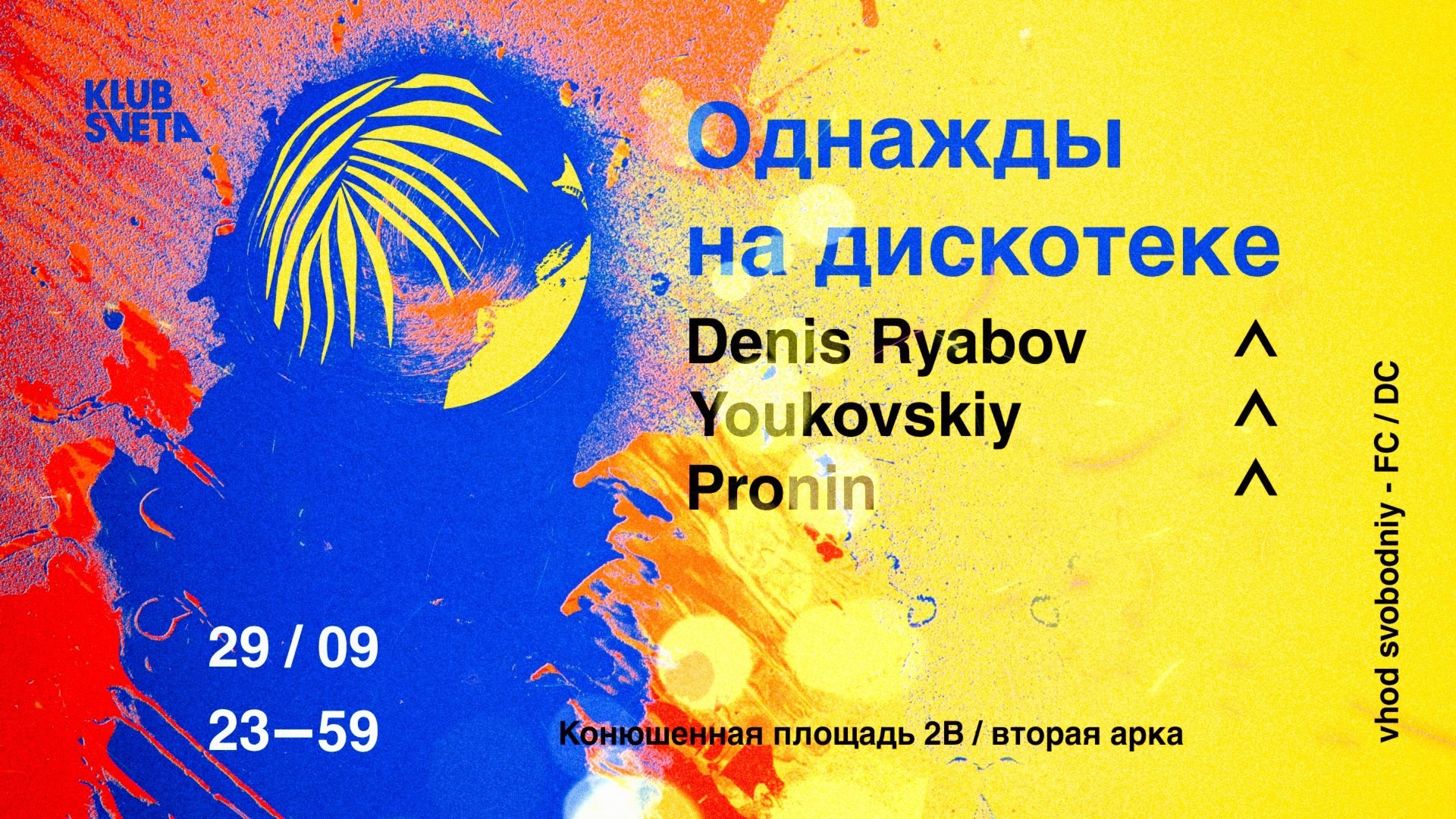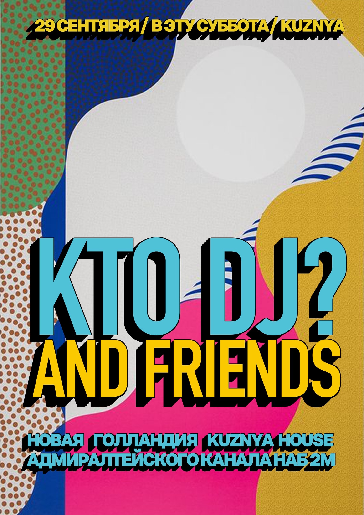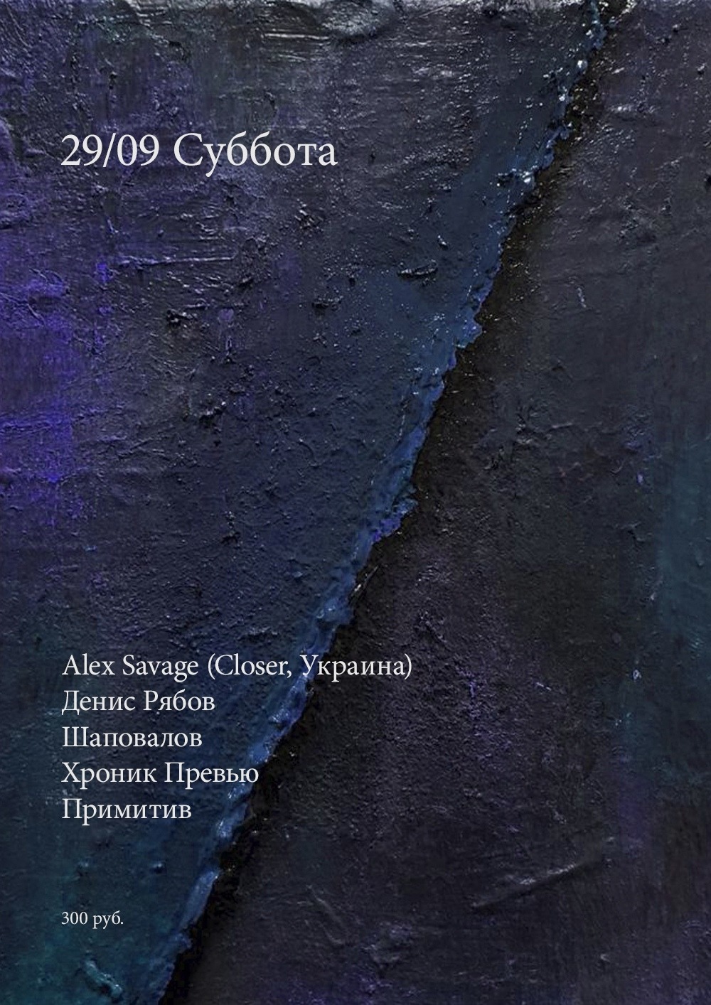 Тусовки: Суббота, 29 сентябряВечеринка не закончится, закончишься ты.1) Mosaique: Core2) Stackenschneider: Try The Pie3) Клуб: Суббота в Клубе4) КПД: Dive! 5) Танцплощадка6) Union7) Kuznya8) Клуб Света9) Cement