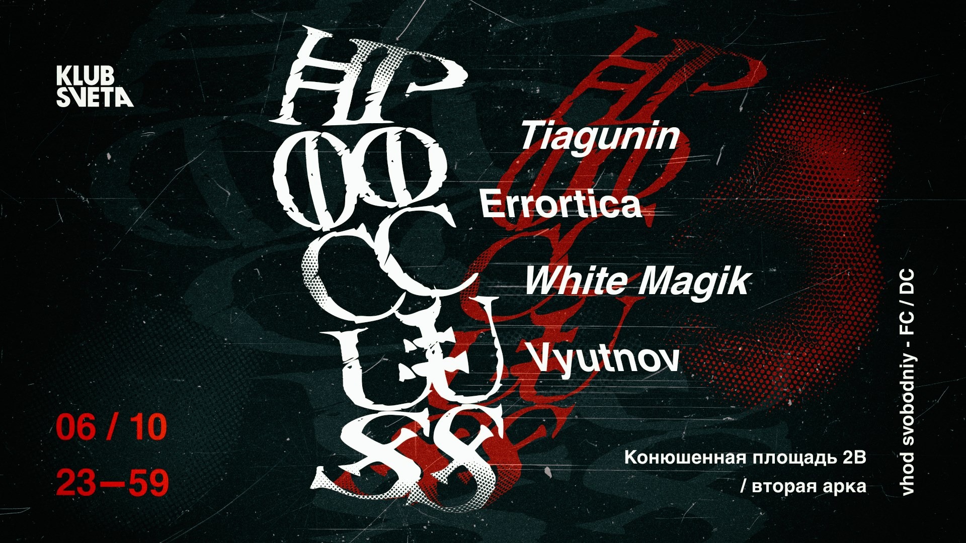 Тусовки: Суббота, 6 октябряВечеринка не закончится, закончишься ты.1) Mosaique: Defuse2) Клуб: Ржавчина3) Stackenschneider: Near Mint4) Танцплощадка5) Клуб Света6) Union7) Мотив