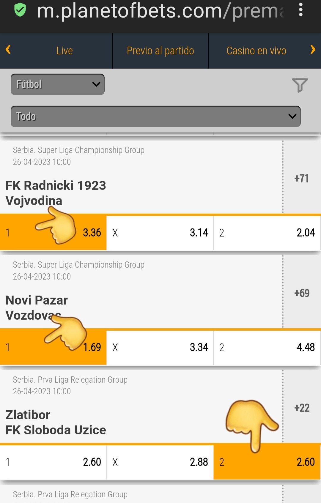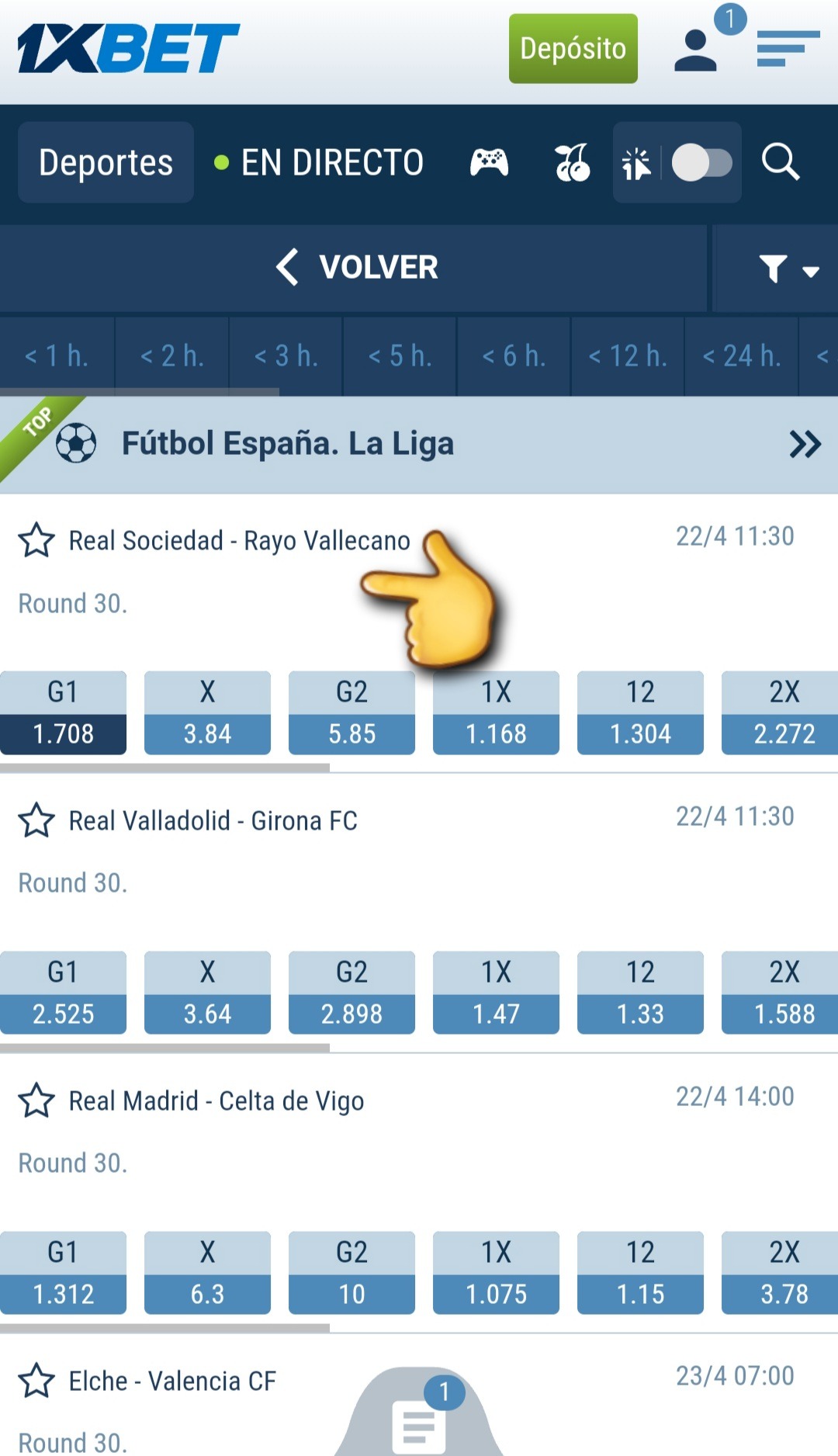 4. Buscas el partido y Seleccionas la apuesta que vas a realizar.