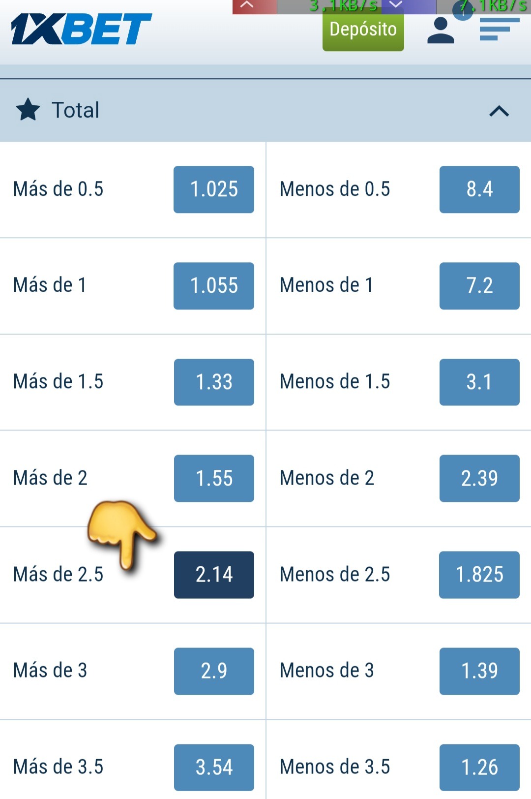 👇 En la imagen mostramos la selección de una apuesta para +2.5 goles para 1xbet👇