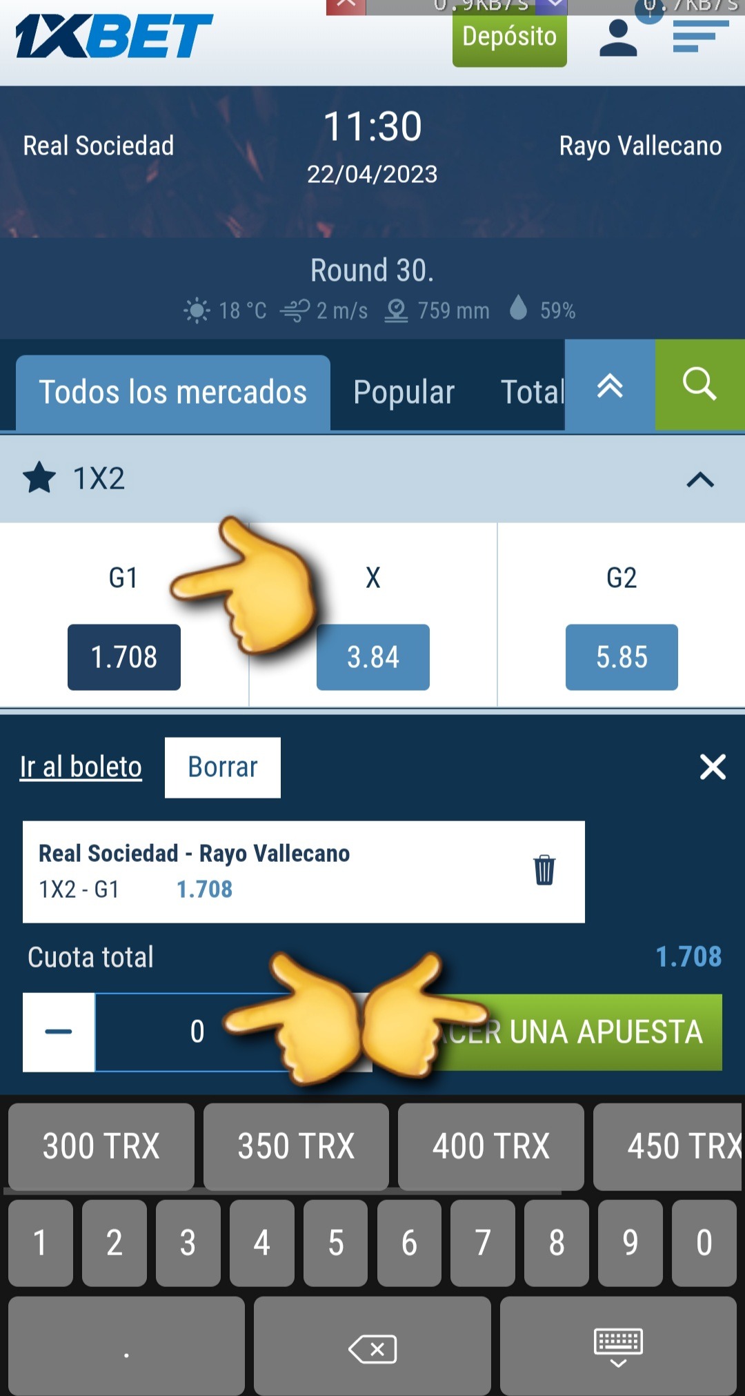 3. Cuando ya tenemos el partido buscamos la apuesta que queremos hacer, la seleccionamos, ponemos la cantidad a apostar y hacemos la apuesta 👇