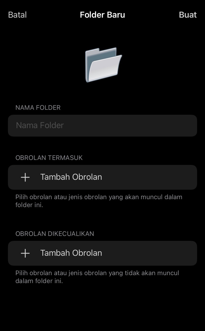 3. Tulis nama folder yang ingin anda buat, Kemudian “tambah obrolan” pada bagian “obrolan termasuk”