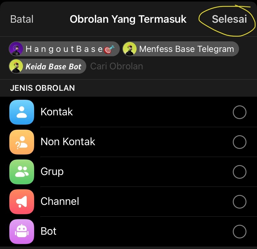 4. Pilih jenis tipe obrolan atau langsung saja pilih group, channel, bot atau kontak yang di inginkan. Bila sudah langsung pilih “selesai”