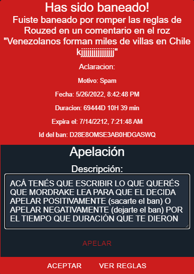 Cuándo te banean del sitio, podés "apelar" tu ban. Que significa esto? que tenés que escribir en el recuadro, lo que vos querés que Mordrake lea para que el decida si te deja o no el ban ya que