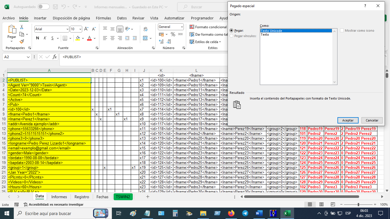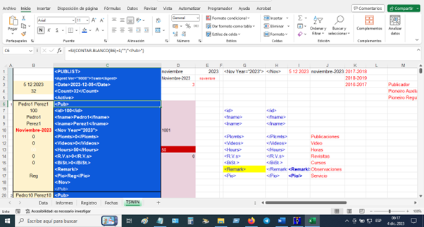 3) Luego de cargar los datos personales y los informes, vamos a la Hoja TSWIN Copias desde <PUBLIST> hasta </PUBLIST>. Columna azul.
