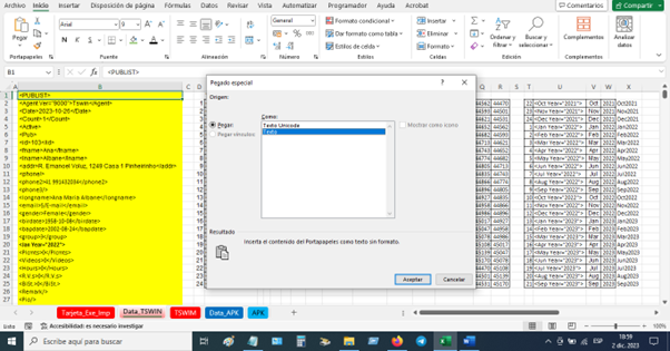 Abrimos el archivo, con Bloc de notas. copiamos todo y pegamos en la columna amarillo con pegado especial.