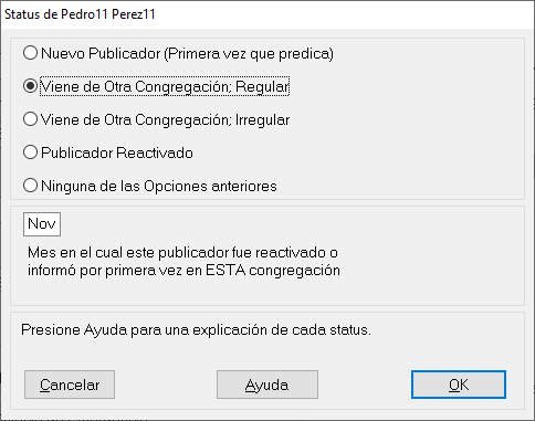 Escogemos la opción viene de otra congregación; Regular. seleccionamos el mes en curso. Damos clic en OK; después en cerrar, y Guardamos los cambios. Se puede seleccionar las otras opciones dependiendo del caso