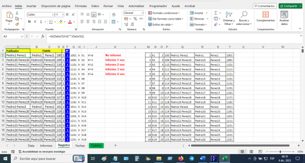 7) En ala Hoja Registro, del archivo Informes mensuales.xlsx aparecerán los datos, para controlar el numero de veces de los informes. Para garantizar que se envíe a la sucursal el ultimo infirme del hermano.