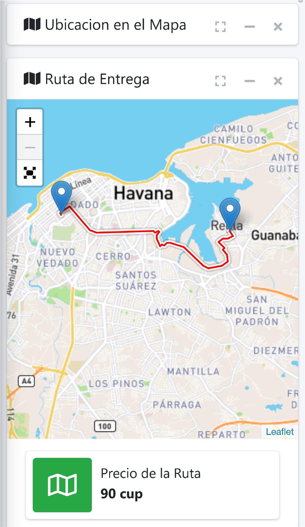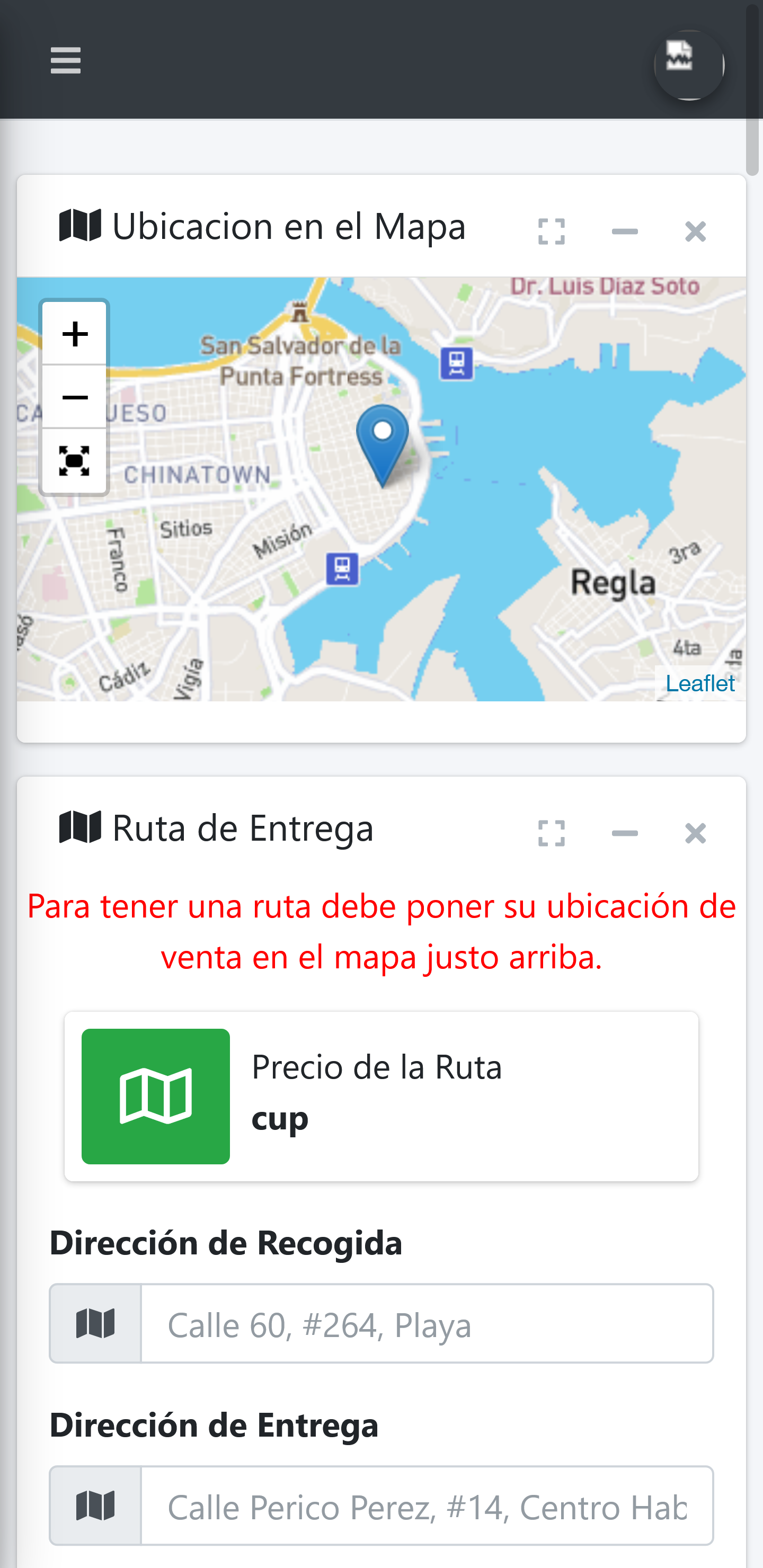 Una vez señalada la ubicación en el mapa, observa que la casilla de la tarifa de envío se ha calculado automáticamente (90 cup en el ejemplo de la imagen). A partir de este momento podrás informarle al cliente de cuanto es la tarifa del envío hasta la dirección que les dio.