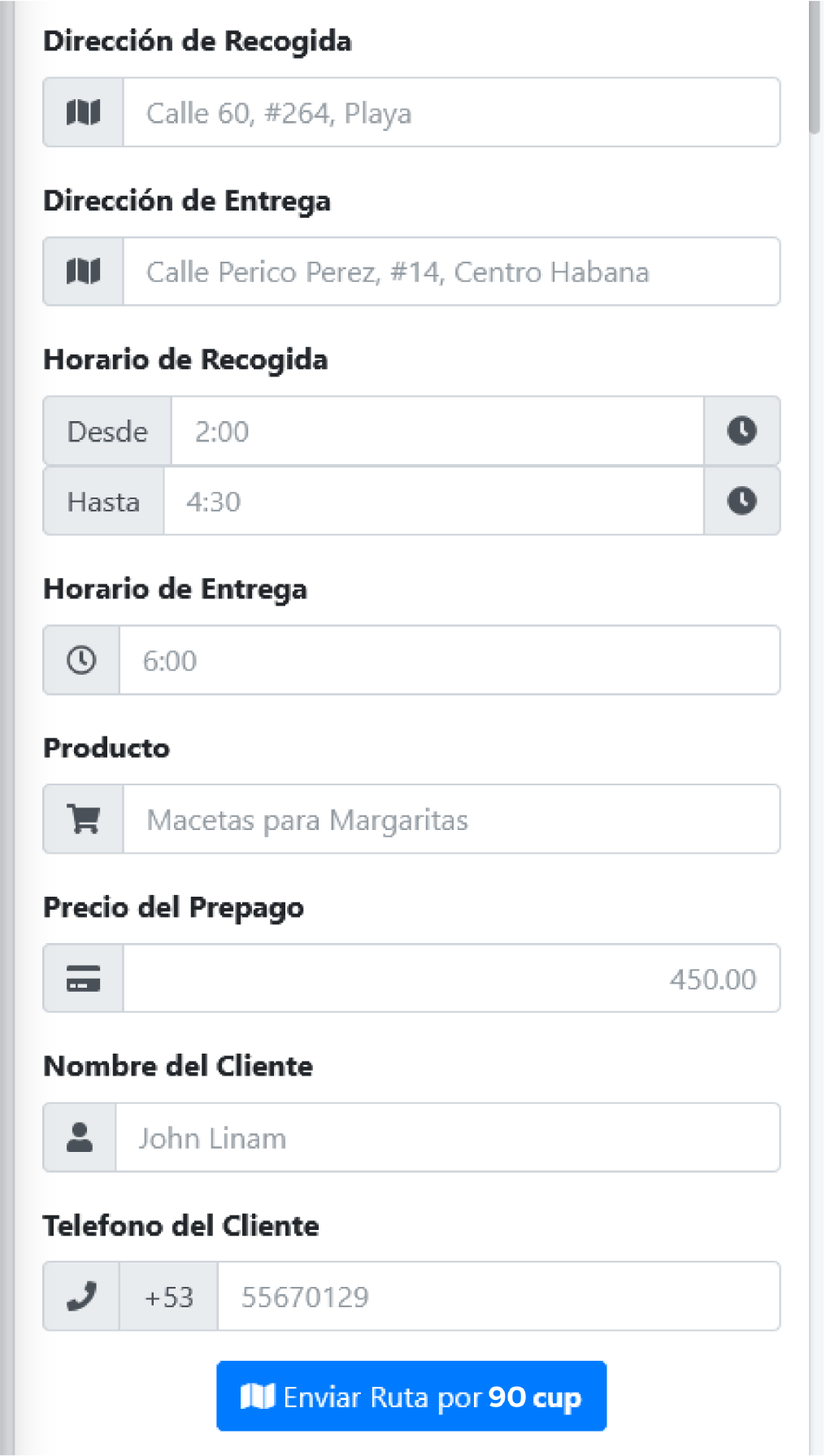 establezca.Fecha de entrega: simplemente define el día que se deberá realizar la entrega. - Hora de entrega: el horario de entrega deberá ser posterior a las 3pm, y siempre con al menos 12 horas de antelación. Es decir, si la entrega es para realizarse a las 7 pm del viernes, esta deberá agendarse antes de las 7 am de ese mismo día, o durante el jueves o cualquier día previo. De agendarse un pedido en menos del tiempo establecido se corre el riesgo de no poder realizar esa entrega. Es importante también tener en cuenta que si se establece un horario de entrega de una hora determinada, el mensajero pudiera llegar con hasta media hora de diferencia. Es decir, si se define que el horario de entrega será las 5 pm, el mensajero pudiera realizar esa entrega de 4:30 a 5:30 pm en dependencia del tráfico y la movilidad por las calles.