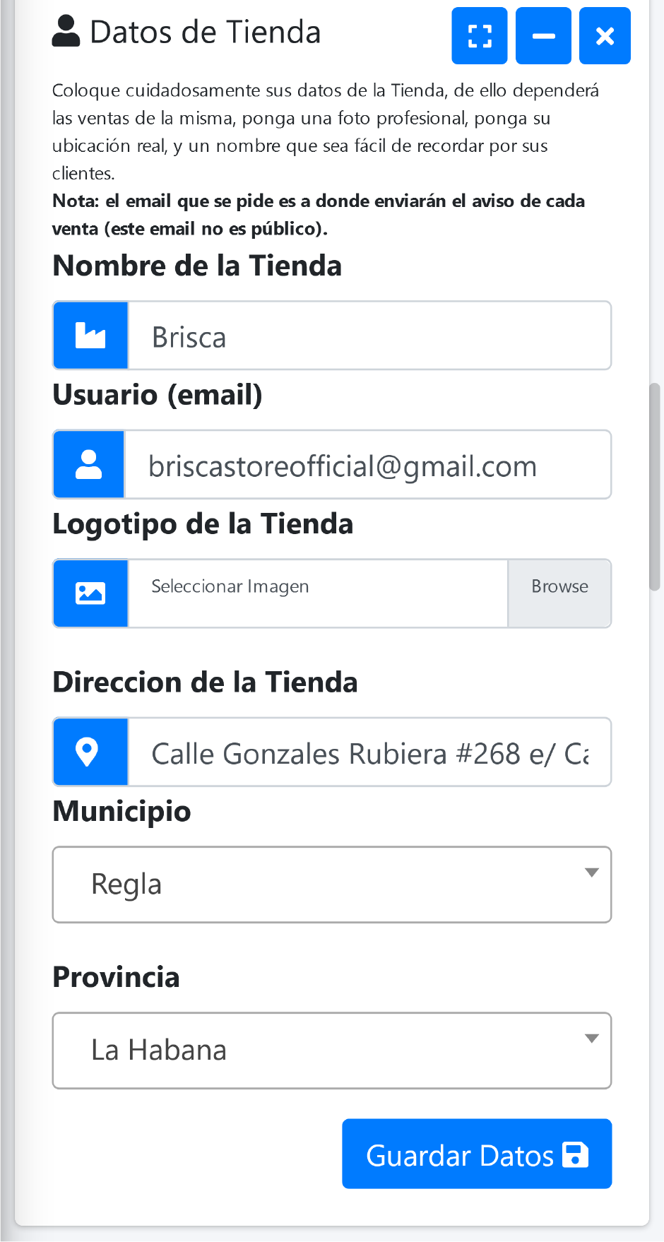- Posteriormente recomendamos ir al recuadro de "Datos de Tienda" y definir aquí todas las características de la tienda como la dirección por escrito, los horarios en que normalmente despachan los pedidos y tal. Hacer esto en este momento le ahorrará mucho tiempo luego a la hora de agendar pedidos, ya que la información relativa a su comercio aparecerá predefinida según los datos de la tienda.