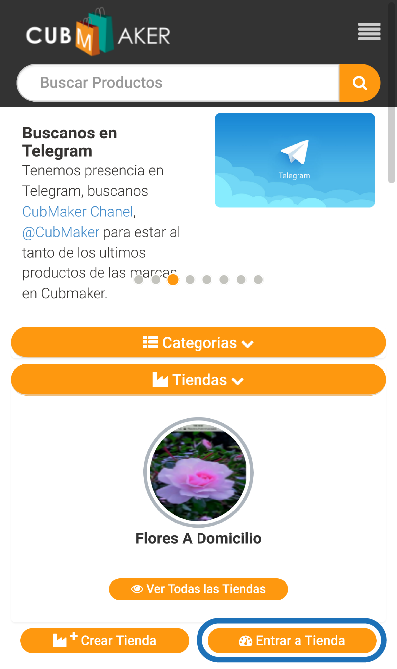 - Desde la página principal de CubMaker, en la pestaña Tiendas, busca el botón "Entrar a Tienda" y tócalo para pasar a registrarte como tienda.
