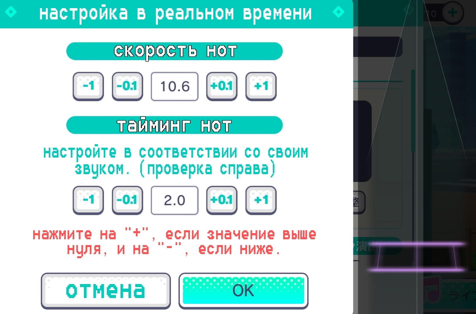 Это смещение нот в соответствии с песней. Вы можете изменить его под себя/свое устройство, использовав предварительный просмотр(3 настройка), если ваш звук не синхронизируется с нотами.