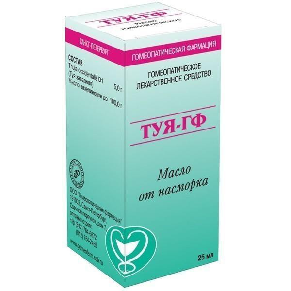 Туя-ГФ . Торговое наименование препарата . Туя-ГФ . Лекарственная форма . масло для местного применения гомеопатическое . Состав . На 100 г: активные компоненты: Thuja occidentalis (Thuja) (туя окциденталис (туя)) D1 - 5,0 г;