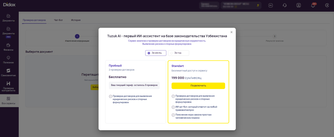 - 2 бесплатные проверки договоров (считаются как Произвольные документы так и отдельный анализ PDF-файла через раздел "Все Сервисы")