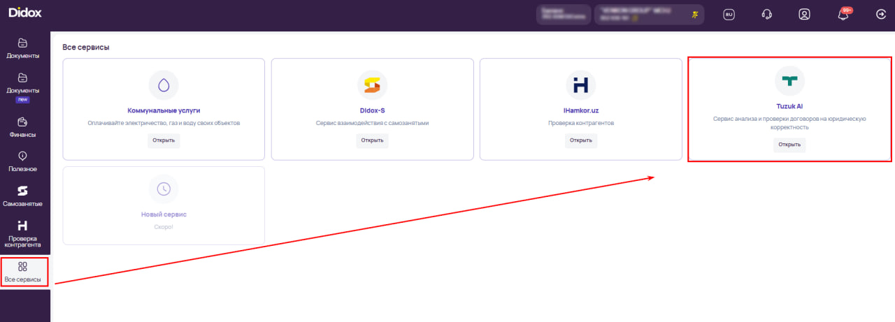 - Откройте раздел "Все сервисы" и перейдите в блок "Tuzuk AI" нажав на кнопку "Открыть"