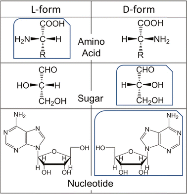مثلا آنزیمها یا سایر اجزاء یاختهها، فقط میتوانند با یکی از آنها کار کنند. در اغلب جانداران زمینی فقط آمینواسیدهای چپگرد و قندهای راستگرد ساخته و مصرف میشود. قندهای چپگرد و آمینواسیدهای راستگرد برای یاختههای ما بیگانه، غیرقابل مصرف و در مواردی حتی غیرقابل شناسایی اند.