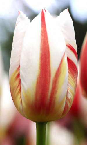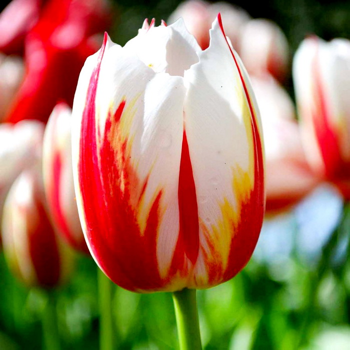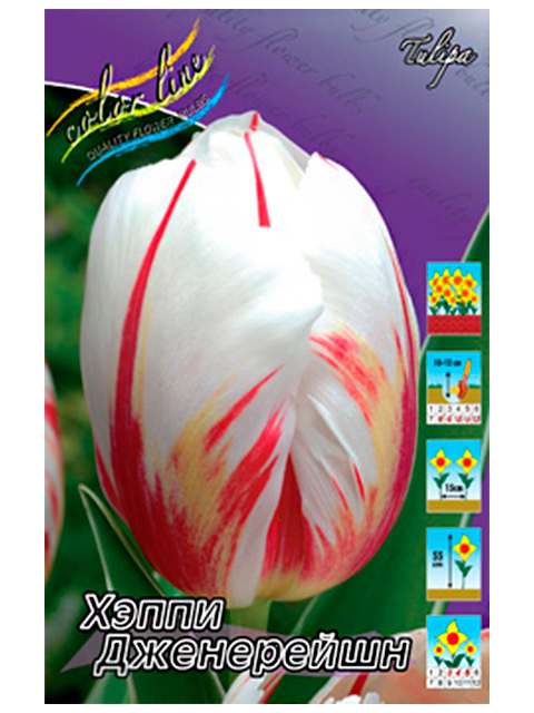 Тюльпан Хеппи Дженерейшн относится к тюльпанам группы Триумф . Цветет тюльпан этого сорта в апреле-мае, образуя шикарный яркий цветок бело-алого, пестрого окраса с высоким бокалом, до 10см .