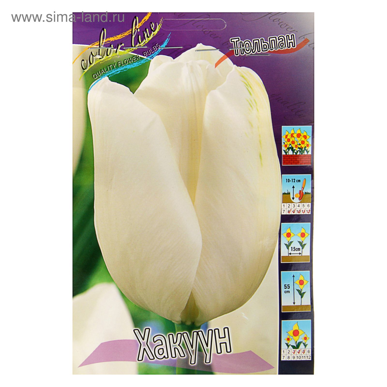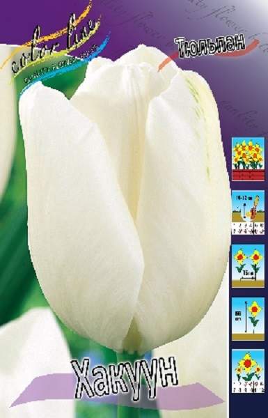 Тюльпан Хакуун (Tulip Hakuun) Тюльпан Хакуун (Tulip Hakuun) > класс : Дарвиновы гибриды . Форма: бокаловидная . Окраска: ярко-белая . Высота бокала: 10 — 11 см . Диаметр бокала: до 6 см . Высота растения: до 55 см .