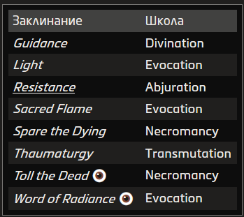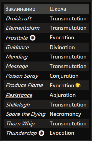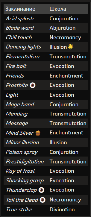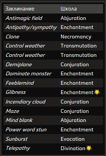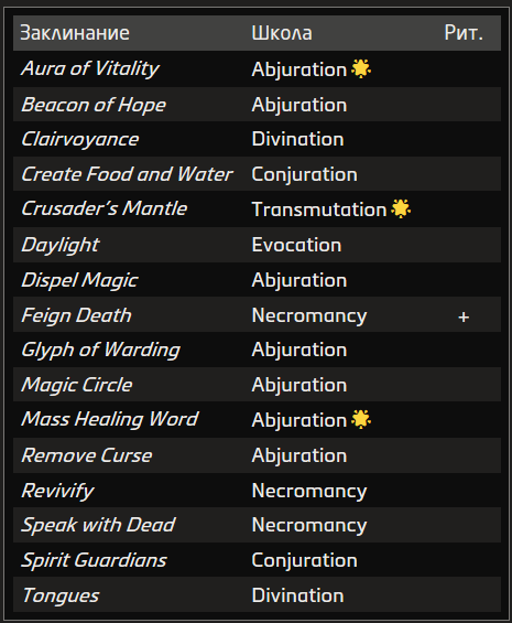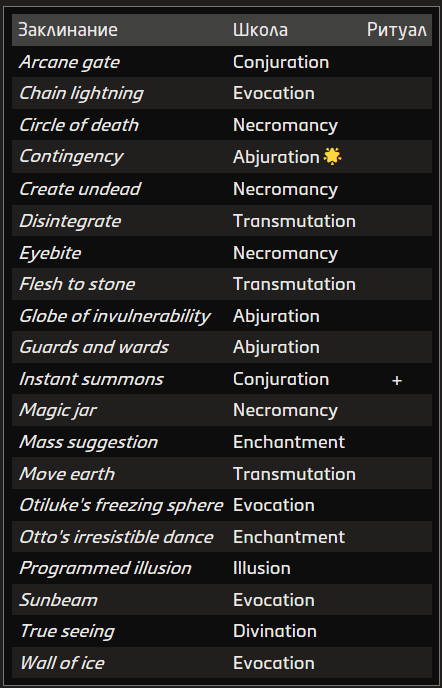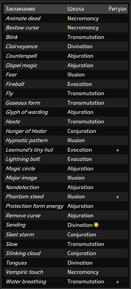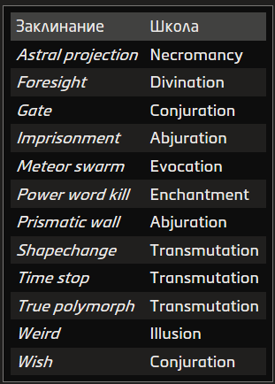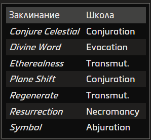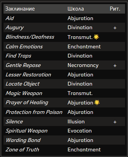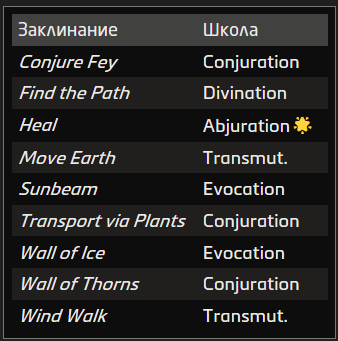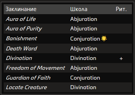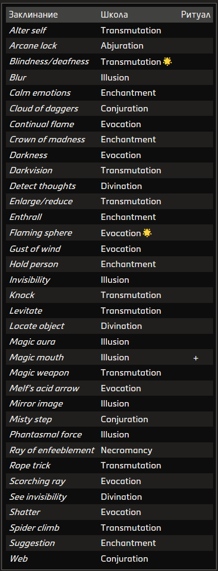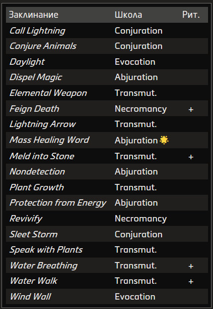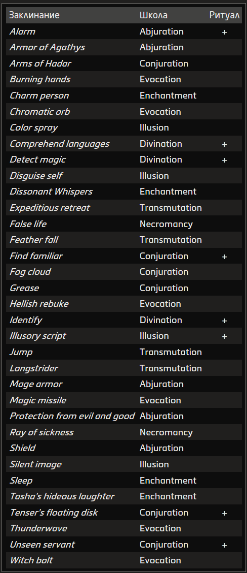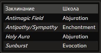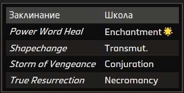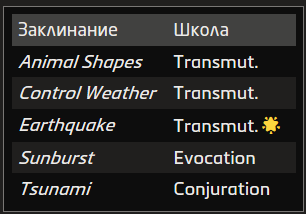 Источник заклинания приведён в скобках после школы магии. Основные источники — природная, священная и тайная магия.