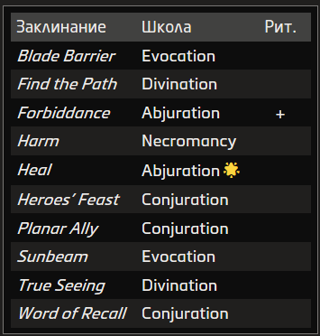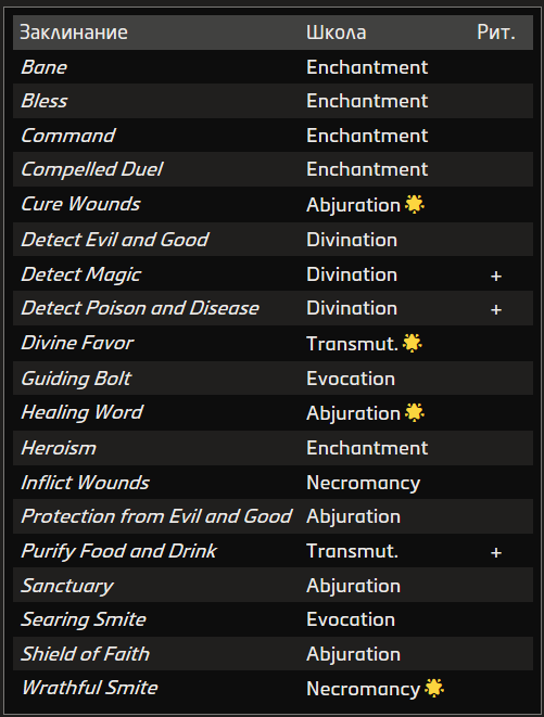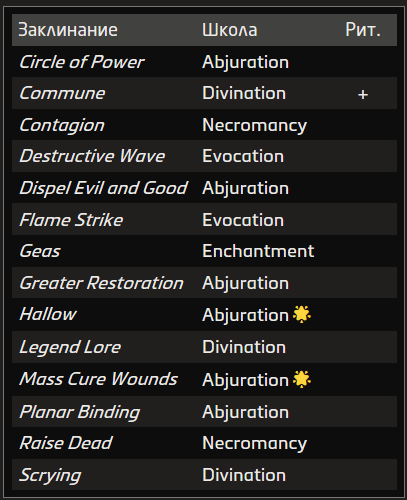 Священное заклинание питается силой богов и Внешних миров. Этой магией владеют клирики и паладины.