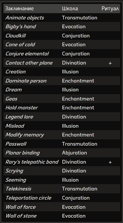 Некоторые заклинания исходят не от них, а от класса — например, от волшебника или чародея. Вы можете произносить такое заклинание только в том случае, если вам это позволяет черта.