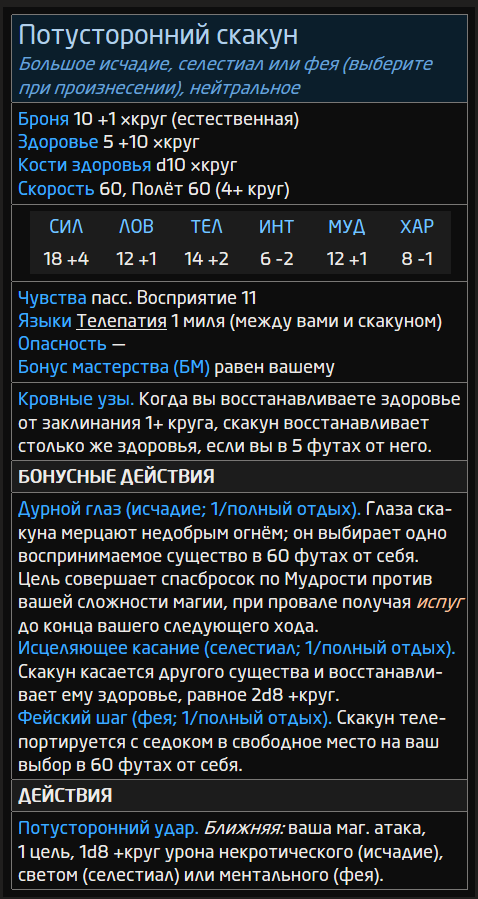 Вы призываете дух, принимающий форму необычно верного скакуна. Появляясь в свободном месте в пределах дальности, дух принимает форму Потустороннего скакуна. Если у вас уже есть скакун от этого заклинания, он заменяется на нового.