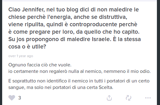 Jennifer possiede un account ask.fm, vorrei farvi vedere alcune risposte che ha dato. Potete comunque trovarle sulla sua pagina. Cerchiamo meglio di capire in cosa crede.