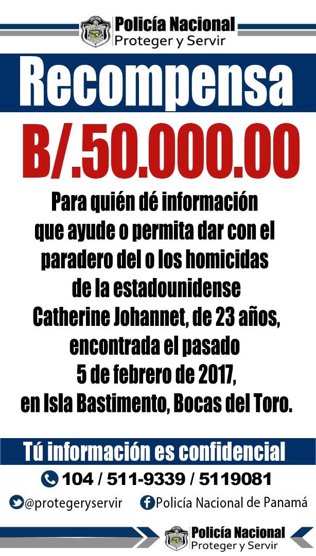 Девятого марта, национальная полиция Панамы установила вознаграждение в 50.000 долларов США за информацию которая будет способствовать задержанию убийцы.