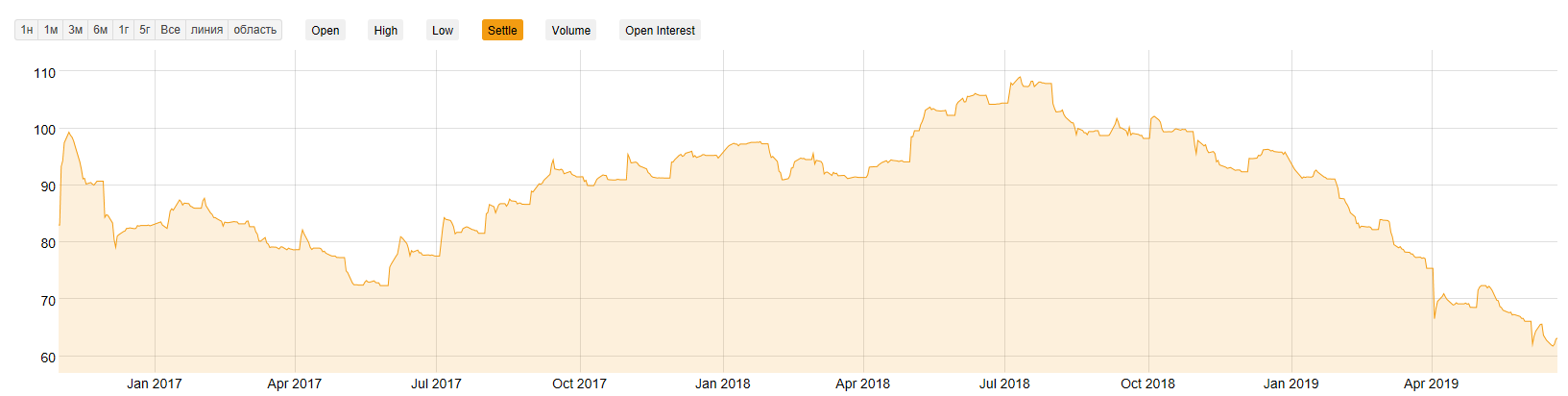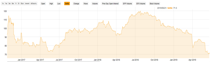 К сожалению производителей энергетического угля, ситуация действительно критическая. Цены на энергетический уголь в Европе начали стремительно падать с конца 2018 года. Посмотрим на динамику бенчмарка CIF ARA (API 2)