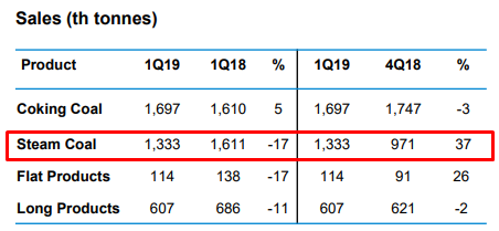 Продажи энергетического угля стабильно составляют 35% всех продаж компании. Падение цен на энергетический уголь наряду с падением цен на сталь и коксующийся уголь окажет отрицательный мультипликаторный эффект на финансовые результаты компании.