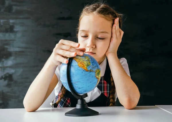 Piękna Mała Uczennica Siedzi Przy Biurku I Uczy Się Online . . .