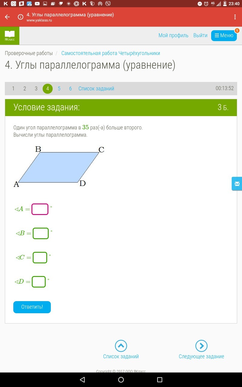 Угол а параллелограмма в 4 раза