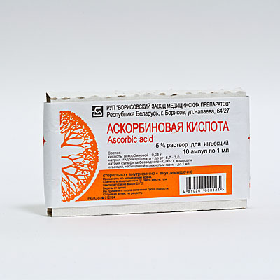 Аскорбиновая кислота 5% 2мл №10 ампулы . вспомогательные вещества: натрия гидрокарбонат- до рН 5,7-7,0, натрия сульфит безводный- 2,0 г, вода для инъекций, насыщенная углекислым газом- до 1,0 л . . .
