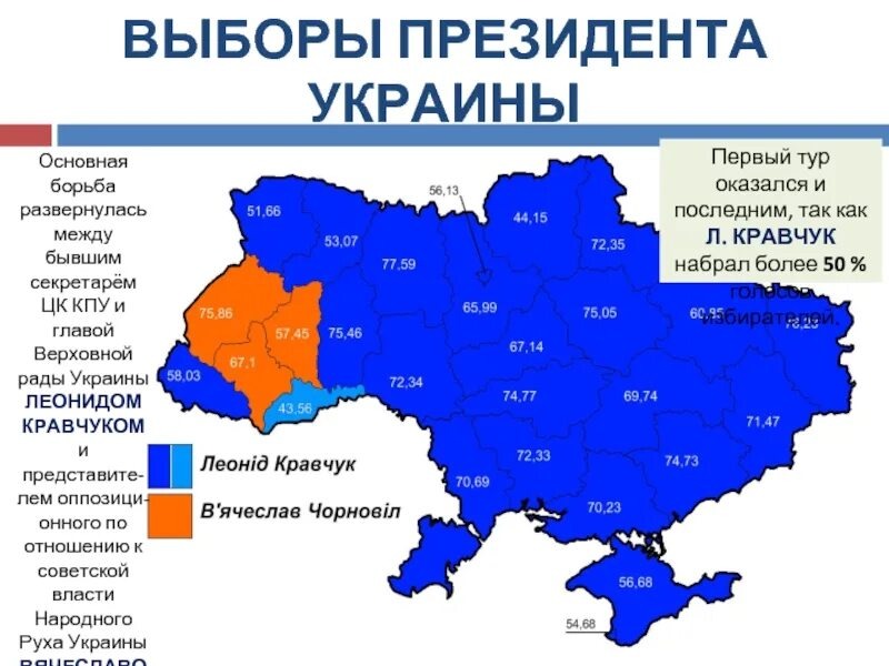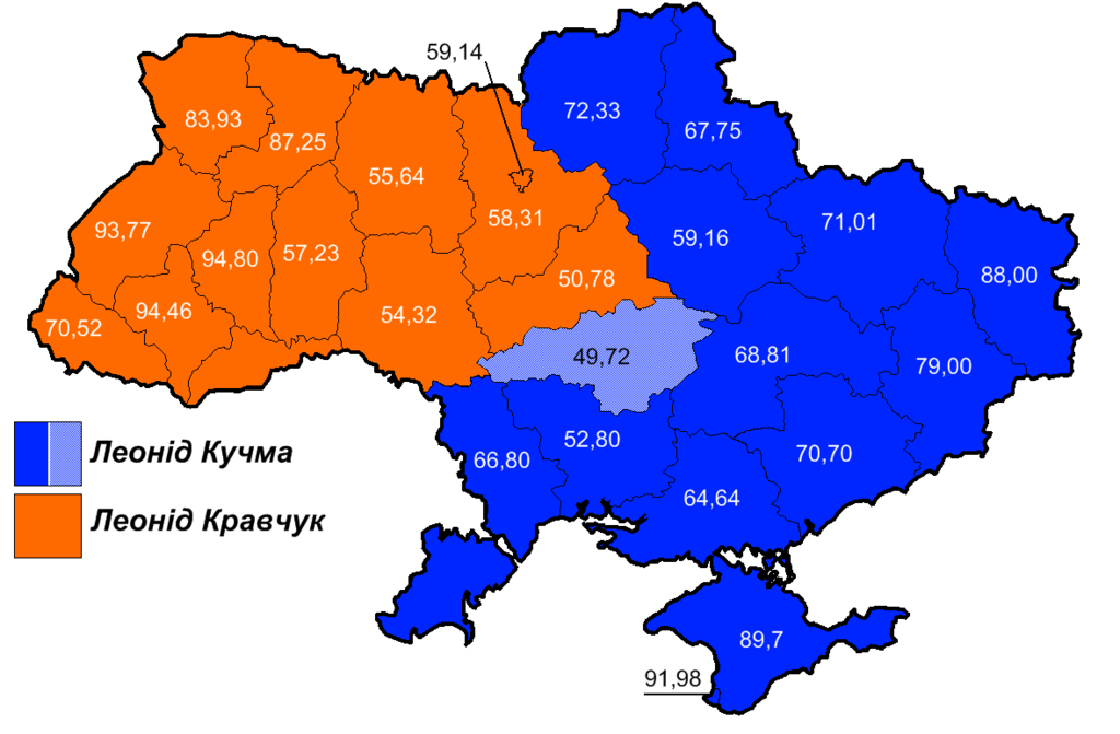 4. Выборы 1996 года. Выбор состоял между Кравчуком или Кучмой. Оба выступали за связи с Россией. Кравчук даже обещал русский язык сделать официальным, но все равно говорил о построении какой-то нации. В результате запад голосовал за Кравчука, а восток поддержал Кучму, который на тот момент ещё играл на чувствах пророссийского избирателя.