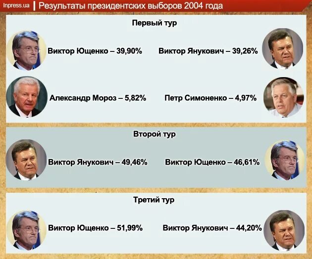 3. Выборы 1999 года примечательны тем, что в финальном туре участвовал лидер коммунистической партии Петр Симоненко, набравший весомые 37,8%. Это говорит о том, что спустя почти 10 лет "незалежности" почти половина населения хотела бы вернуться к социализму. В 99 году президентом стал Леонид Кучма, который из советского инженера превратился в украинского националиста-русофоба и издал в последствии книгу " Украина не Россия". А издал, кстати говоря в Москве. Однако, за Кучму голосовали потому что он днепропетровский и ещё в свой первый президентский срок не пытался резко испортить отношения с Россией.