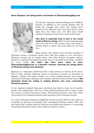 Krystyna's lessons on successful dating Ukrainian ladies: My second dating guide offers you serious and useful tips you must follow on your adventure to find your special Ukrainian woman for marriage . My ebook contains remarkable lessons, rules and tips that can help significantly to improve your success with foreign ladies .