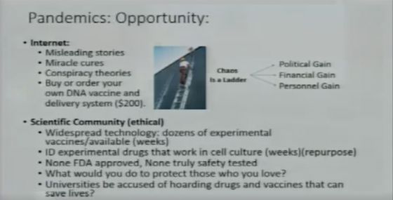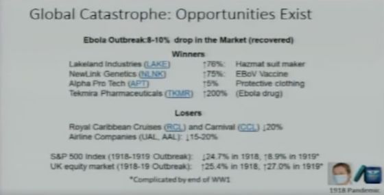 Во время своего выступления в 2018 году «Представляя следующую пандемию гриппа - и как ее предотвратить!» он представляет слайд под названием «Глобальная катастрофа: возможности существуют». На слайде показано, какие типы акций и отраслей резко выросли во время вспышки Эболы, и он использует эти данные для экстраполяции финансовых советов о том, как «заработать деньги в следующей пандемии».