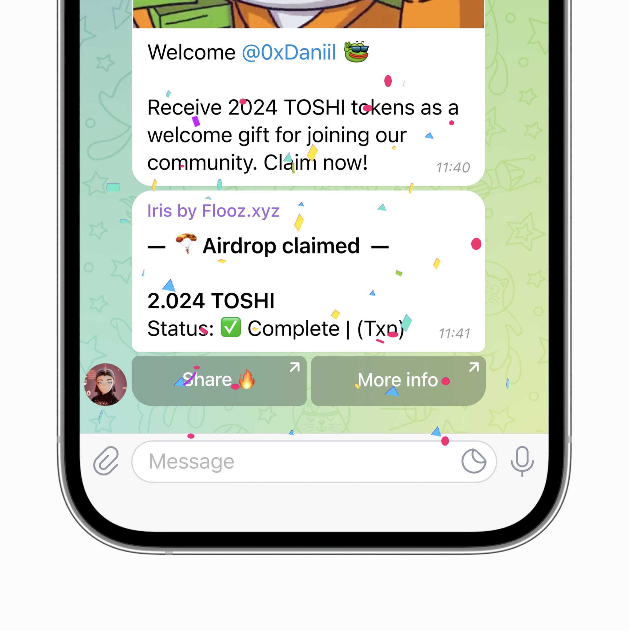 Whenever an airdrop has been initiated, e.g. via Join2Earn, Chat2Earn, Raid2Earn or other use cases, your community members are notified that they can claim an airdrop. Each notification contains a link to claim their airdrop.