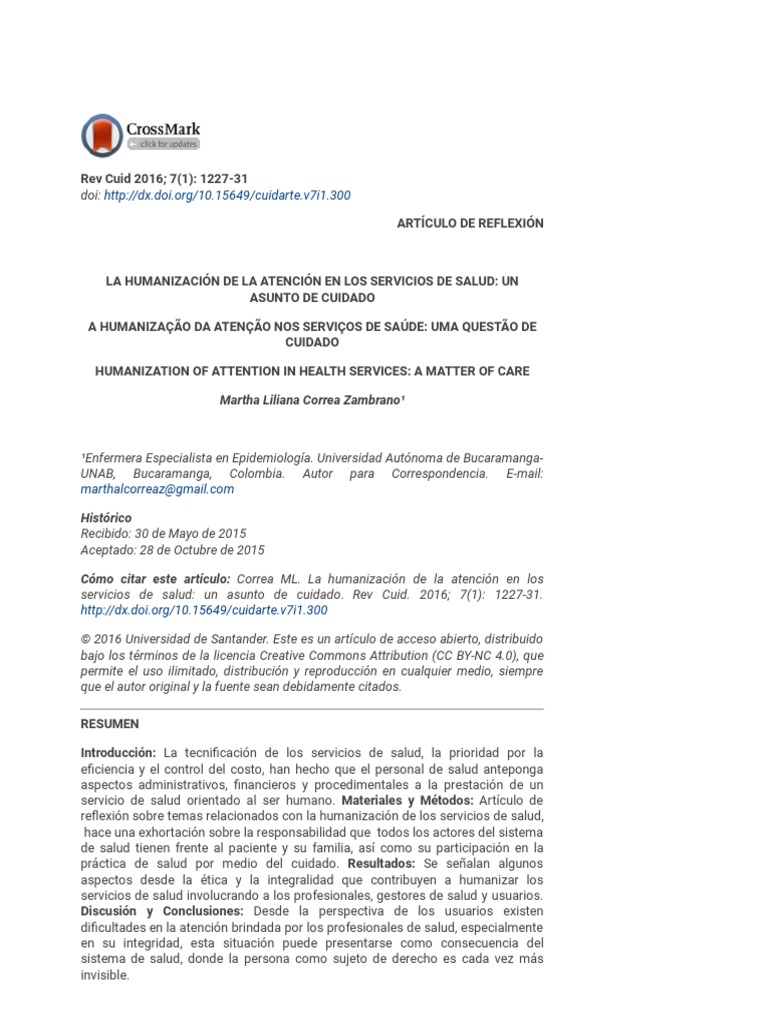 LA HUMANIACIÓN DE LA ATENCIÓN EN LOS SERVICIOS DE SALUD UN ASUNTO DE CUIDADO 1228 Rev Cui 2016 71 122731 INTRODUCCIÓN Una de las mayores preocupaciones que afrontan los profesionales, gestores y usuarios de los sistemas de salud, es la humanización de los servicios de salud, tal y como lo plantean las diferentes normativas y documentos (1) . La enfermedad y la atención de ésta constituyen