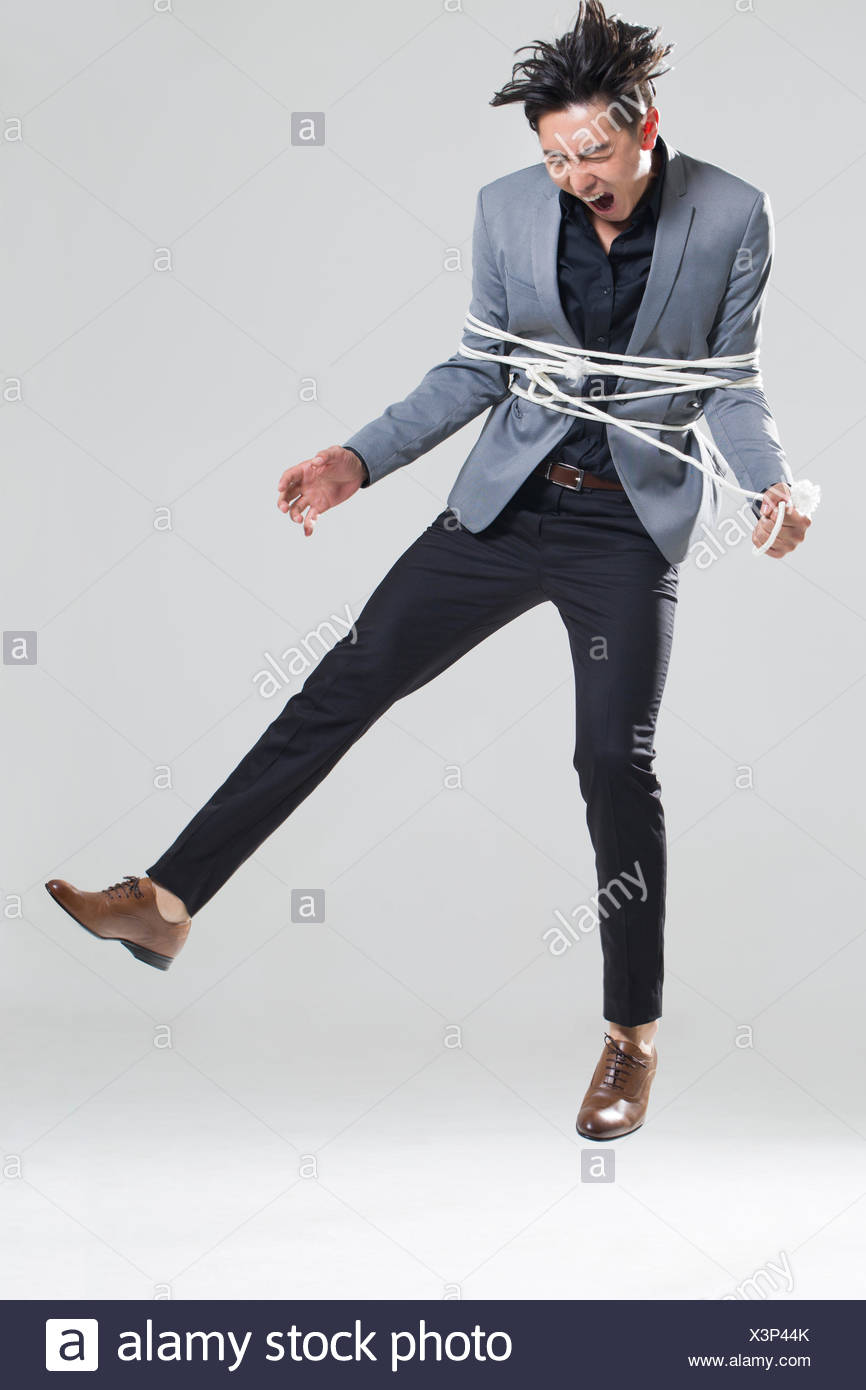 Foto circa Uomo senza camicia torturato legato con una corda . Immagine di shirtless, grigio, grido - 50514792
